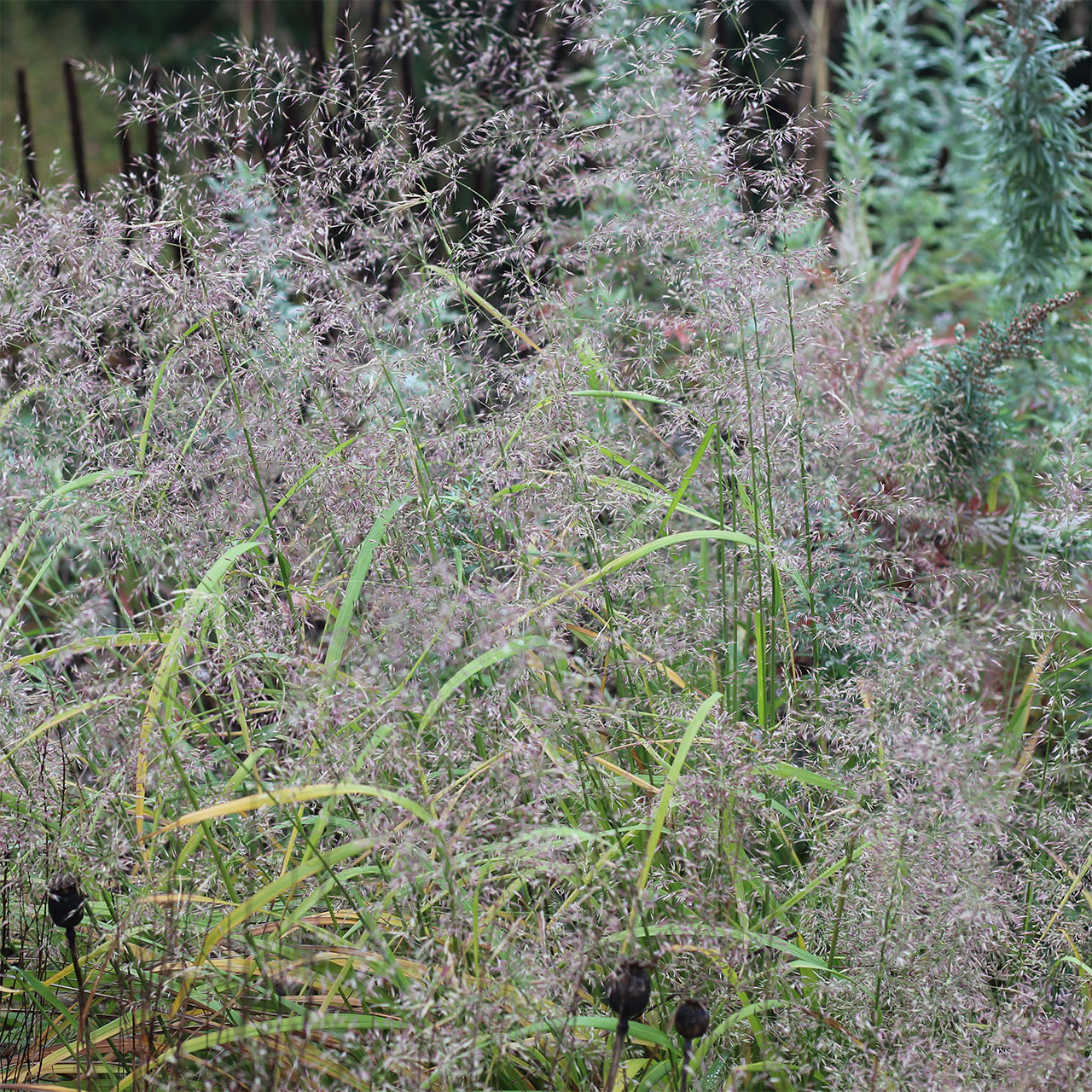 Later flowering than the better known Calamagrostis brachytricha with looser airier panicles of flowers. Calamagrostis effusiflora is always at its best after we close the garden in October and deserves to be more widely known – combining beautifully with late asters, tender Salvias and in our garden the silvery foliage of Artemesia indica var. momiyamae . Height 1.2m. Sunny position. This is the first time that we have offered divisions off this stunning plant.