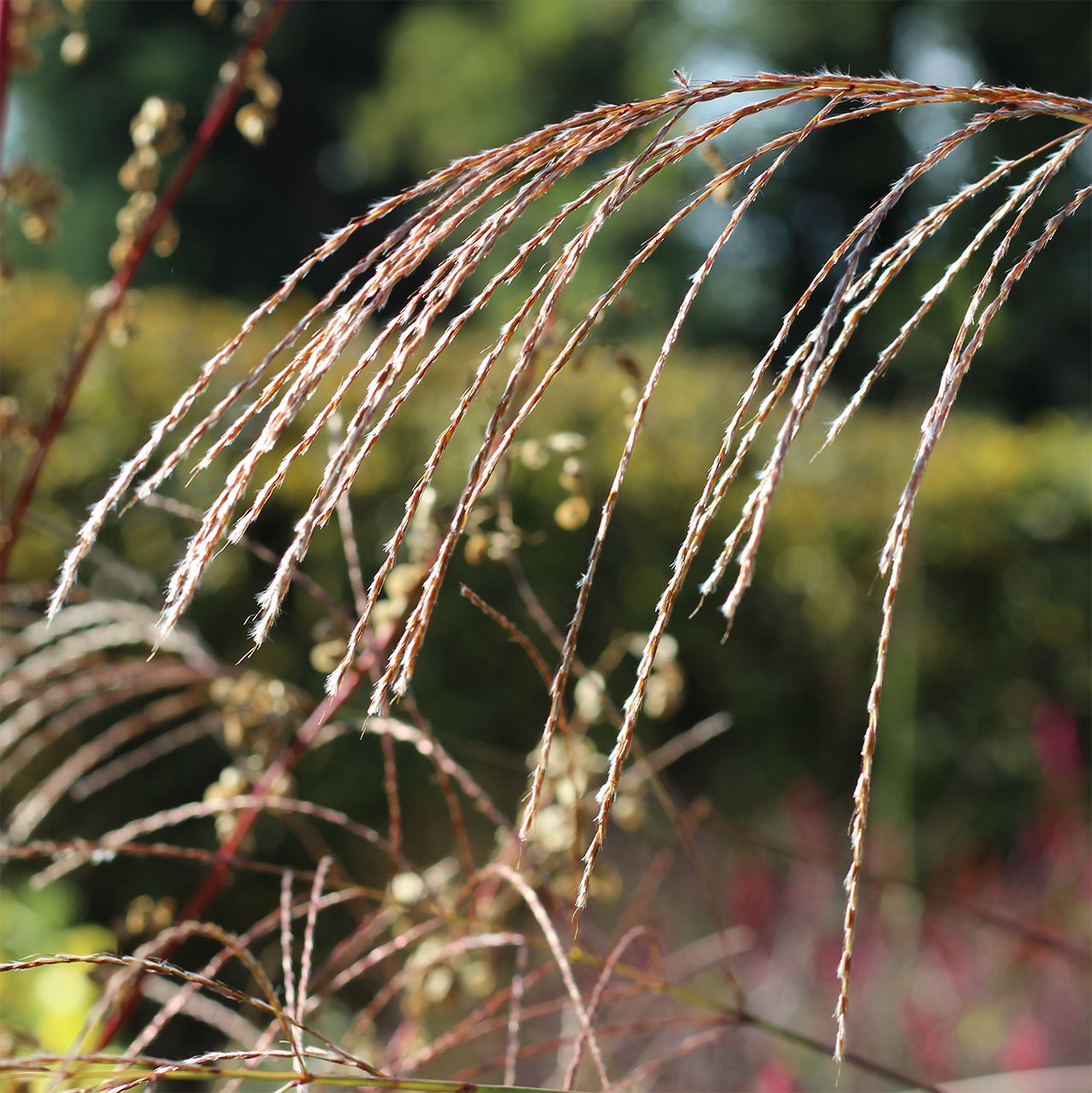 Miscanthus nudipes is a naturally occuring species from the Eastern Himalayas: found in Nepal, Tibet and Assam at high altitudes. It has happily overwintered here in Shropshire and seems tougher than the better known species Miscanthus nepalensis. It is known not only for its hardiness but also its drought tolerance and is therefore being used in a lot of new Miscanthus breeding programmes. The beautiful flower heads are large but delicate with fine pinkish brown dangling threads creating a lovely ethereal effect. Height 1-1.2m. Sunny position and reasonable drainage.