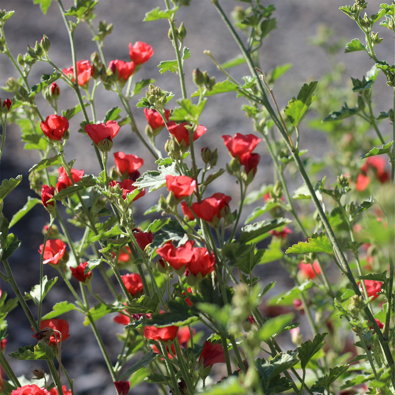 One of the most commented on plants in the garden, Sphaeralcea ‘Newleaze Coral’ is a shrubby member of the mallow family. Silver grey foliage is adorned by small coral red mallow like flowers all Summer and into Autumn. Height 80cm. Sunny position with good drainage and shelter from cold winds.